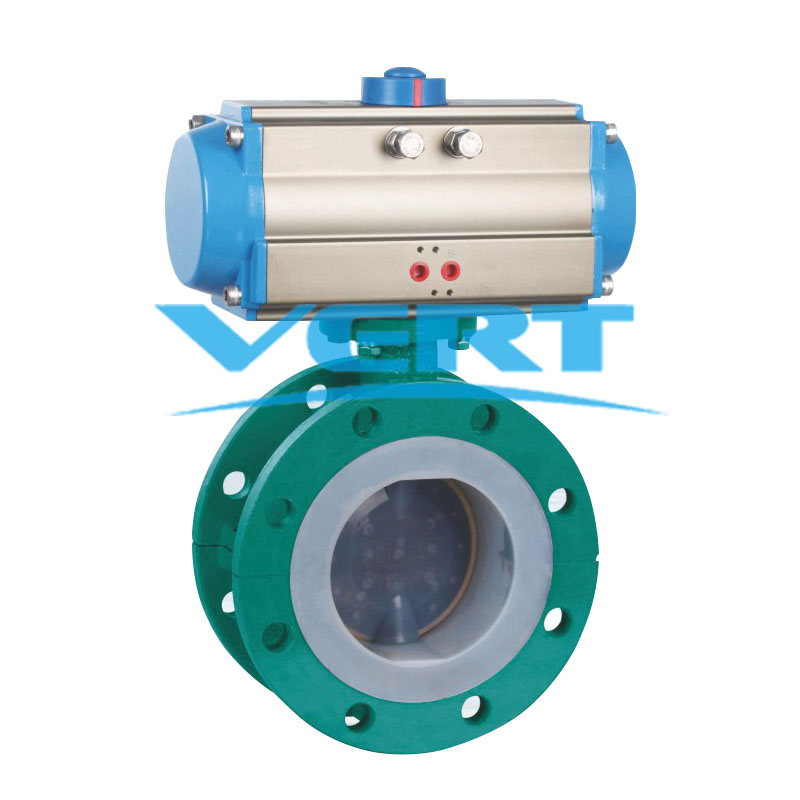 Pneumatic actuator control butterfly valve is YFM patent product, which belong to D671waferandD 641 flange type lined butterfly valve series, consist of pneumatic actuator and lined butterfly valve. These valves are divided into fully lined butterfly valve and half lined butterfly valve according to different lining ways.Fully lined butterfly refers to the PTFE/PFA/FEP seat and disc lined with PTFE/PFA/FEP. There is silicon pad to adjust pre-tighten for keeping the best sealing. valve body is split.The sealing of axis end is controlled by Viton which locate between disc and seat, so that the axis is out of touch medium to ensure the sealing without any leakage.